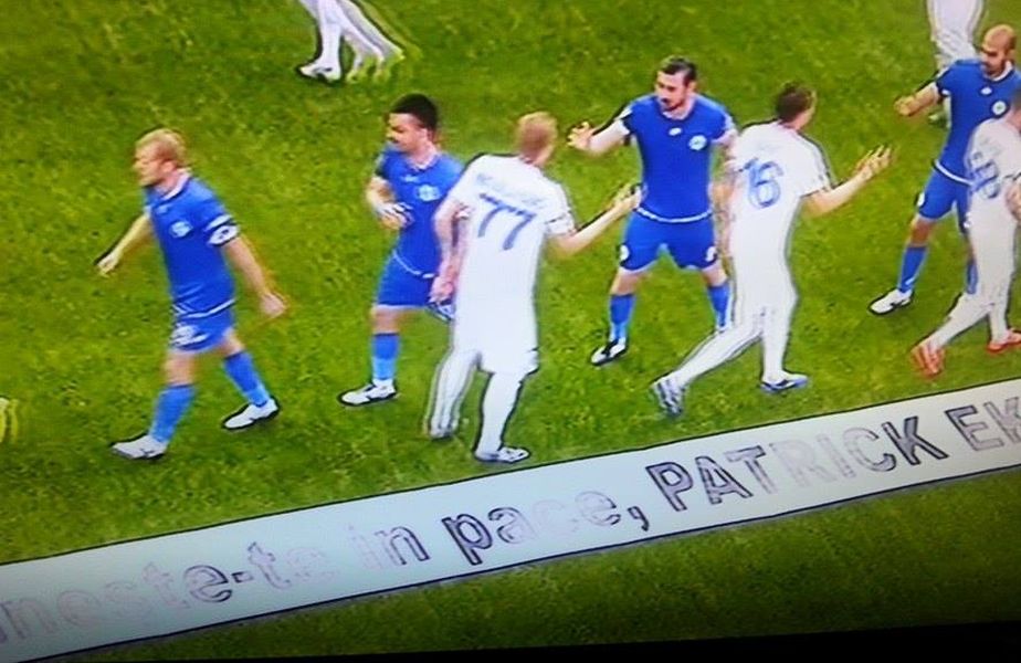 Jucătorii celor două echipe au intrat pe teren cu un banner cu mesajul "Odihnește-te în pace, Patrick Ekeng".