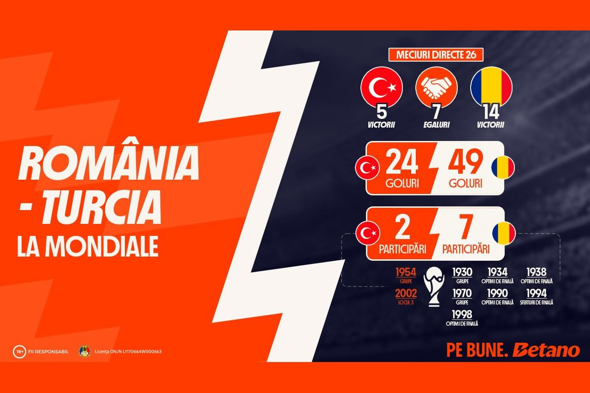 Barajul pentru calificarea la Cupa Mondială din 2026 propune un duel cu greutate istorică: Turcia vs. România. Dincolo de miza uriașă a calificării în ultimul act al barajului, confruntarea aduce în prim-plan două naționale cu parcursuri diferite pe scena mondială și cu un trecut direct care înclină balanța, cel puțin statistic, în favoarea „tricolorilor”. Pe Betano, la cel mai bun operator online, meciul de la Istanbul se trăiește mai intens cu opțiunea de pariere Bet Builder Boost.