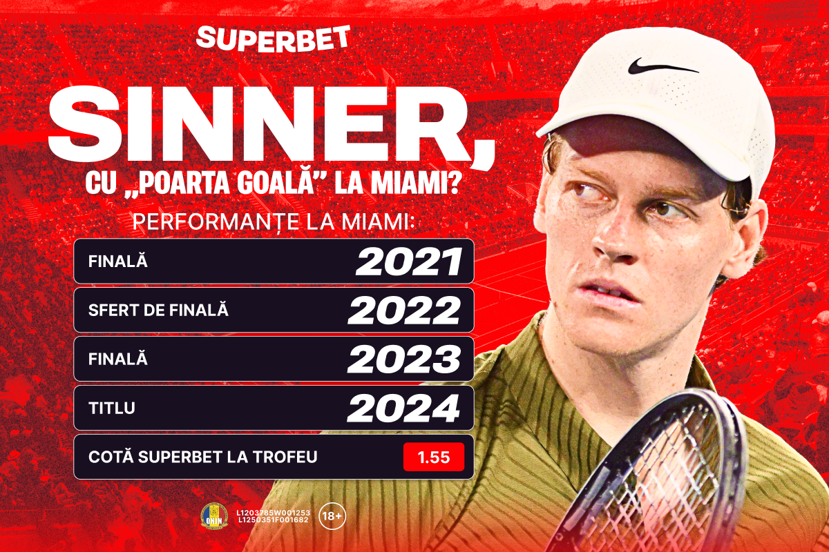 Sinner e de departe marele favorit la realizarea Sunshine Double, câștigarea Indian Wells și Miami în săptămâni consecutive, cu o Cotă Antepost Superbet de 1.55! Principalul pericol?