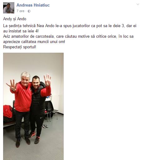 "La ședința tehnică Nea Ando le-a spus jucătorilor că pot să le deie 3, dar ei au insistat să ieie 4! Aviz amatorilor de cârcoteală, care căutau motive să critice orice, în loc să aprecieze calitatea muncii unui om! Respectați sportul!".