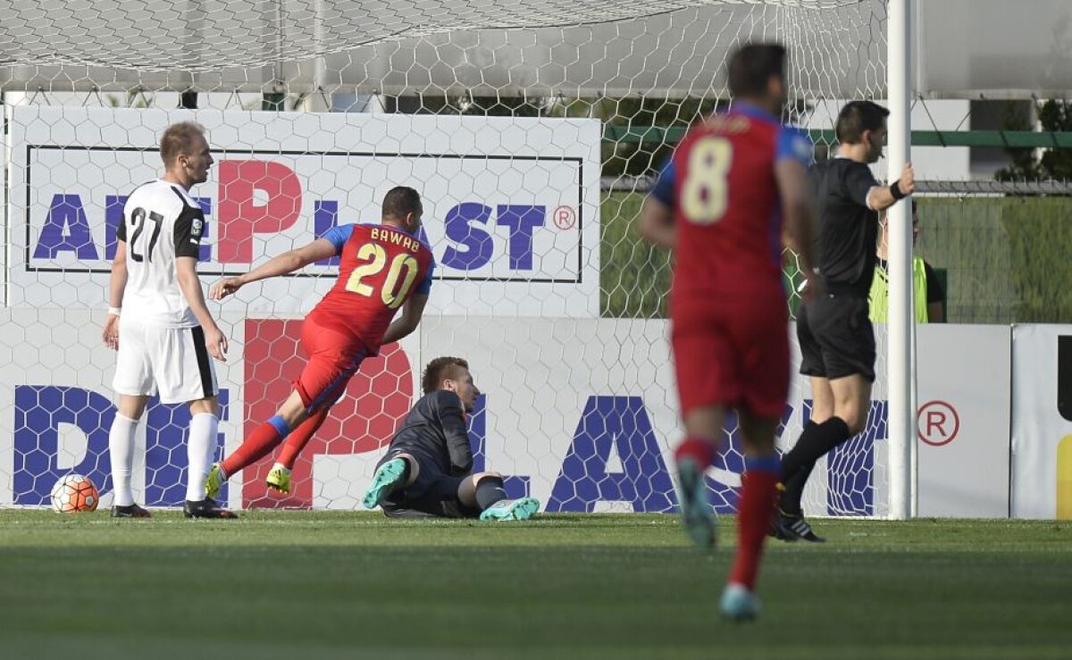 Steaua e mai organizată, pune stăpânire pe mijloc, Muniru scoate cu fault mingea de la Teixeira, Hațegan nu clipește, Marica îl servește pe Bawab și acesta marchează simplu, primul gol pentru Steaua, din mijlocul unei defensive încropite și oricum apatice.