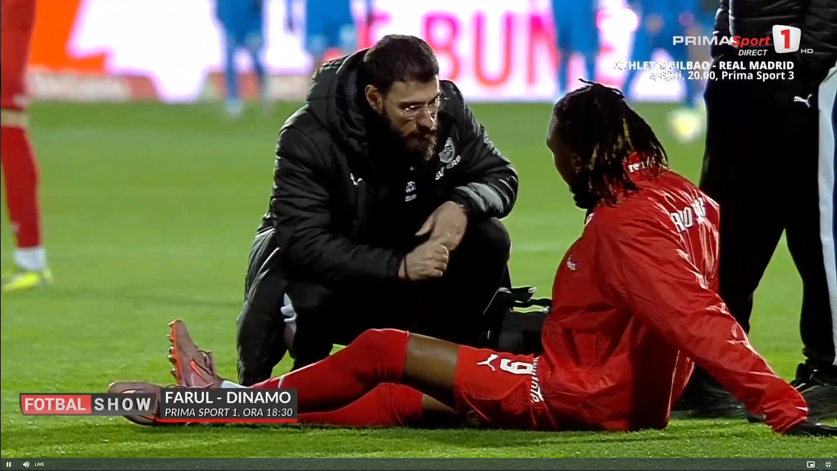 : Mamadou Karamoko s-a accidentat la încălzire înainte de Farul - Dinamo // FOTO: captură Prima Sport