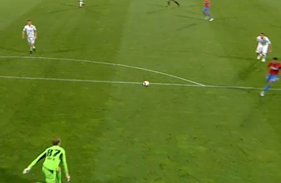 Fundașul maghiar Adam Lang a avut o intervenție total greșită, iar pasa lui nu a mai ajuns la coechipierul Arlauskis, ci a fost interceptată de Florinel Coman, care a finalizat nemilos.