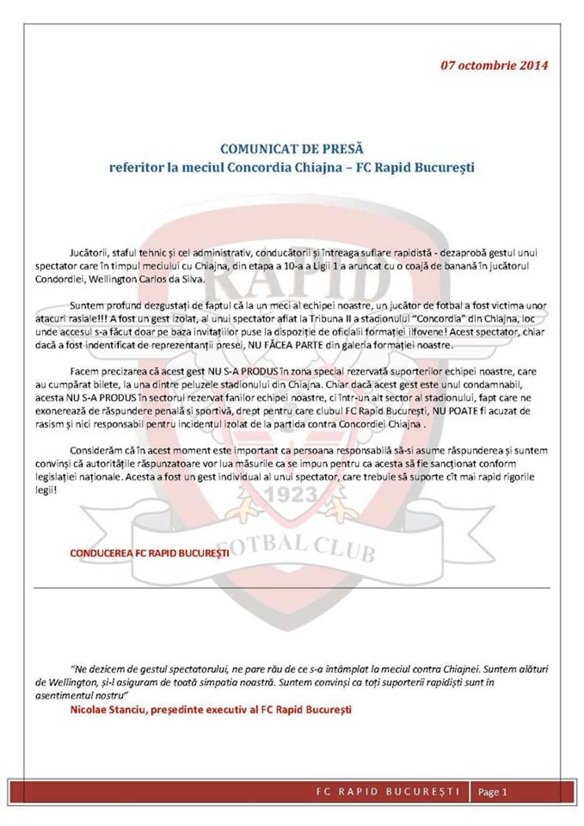 Clubul Rapid se dezice de spectatorul care a aruncat cu o banană spre Wellington! Comunicatul oficial al clubului şi reacţia lui Mircea Sandu