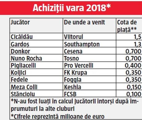 Există însă experiența stagiunii 2018-2019. Din numeroșii fotbaliști transferați atunci, nouă la număr, doar trei s-au dovedit cu adevărat niște întăriri: Cicâldău, Pigliacelli și Elvir Koljic.