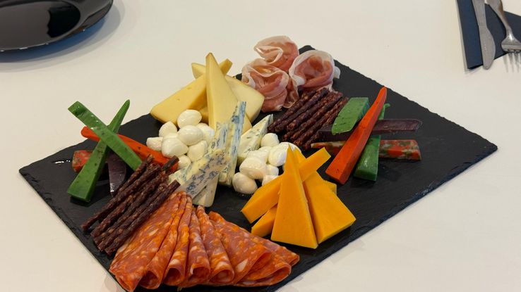 Pe platourile din lojă, organizatorii i-au pregătit lui Șucu: chorizo, prosciutto, burrata, cârnați sticks, gorgonzola și diferite sortimente de cașcaval. Pe un alt platou, Dan Șucu are pregătit chiftele, ridichi, inele de ceapă, măsline, pachețele de primăvară, salată de vinete cu rodie și roșii cherry.