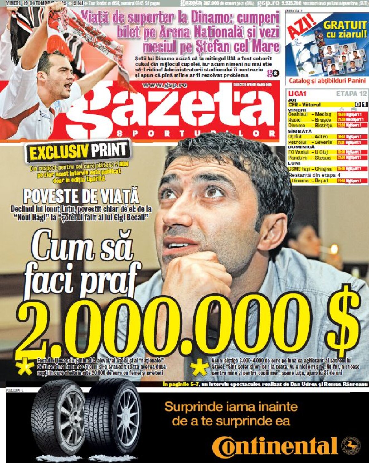 Într-un interviu spectaculos găzduit de ediţia tipărită a Gazetei de azi, el rememorează cum şi-a prăpădit toată averea după nopţi în care cheltuia cîte 20.000 de euro cu femei şi prieteni. "Acum lucrez pentru nea Gigi, sînt şofer şi om bun la toate. Nu e nici o ruşine să munceşti", spune Luţu, ajuns la 37 de ani.