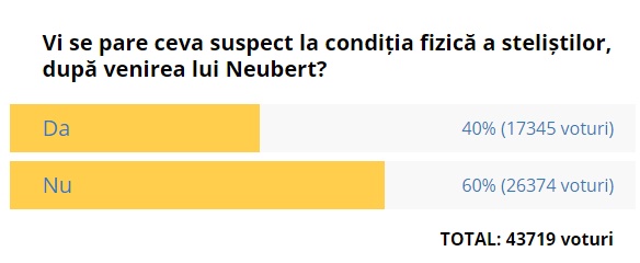 Într-un sondaj GSP.RO, 44.000 de cititori au răspuns întrebării "Vi se pare ceva suspect la condiția fizică a steliștilor, după venirea lui Neubert?".