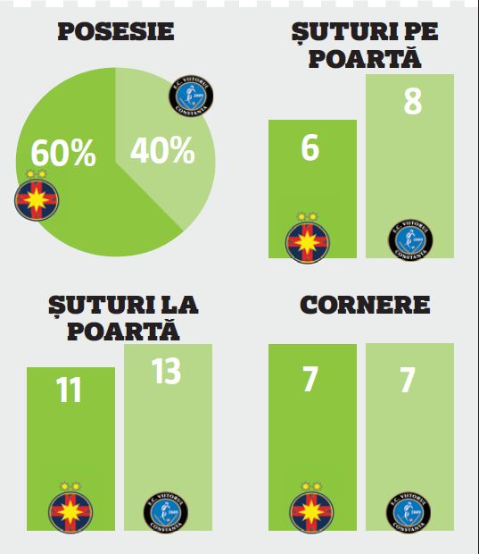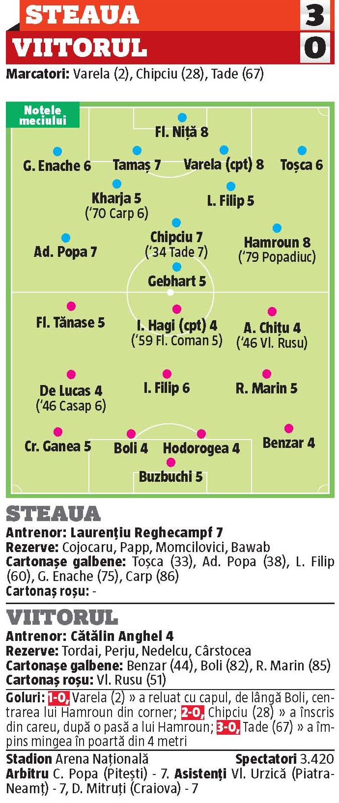 Steaua s-a impus pe teren propriu în fața Viitorului, scor 3-0, în etapa a opta din play-off și așteaptă pașii greșiți ai Astrei pentru a mai spera la titlu.
