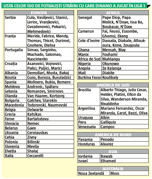 Mai mult de jumătate, 56 la număr, au fost și au rămas europenii. Urmați de africani, de sud-americani, de nord-americani, de asiatici și de un neo-zeelandez. În ultimele perioade de mercato, Dinamo a ajuns să aducă mai mulți fotbaliști străini decât români, pe principiul "cei de aici sunt mult mai scumpi decât cei din străinătate".
