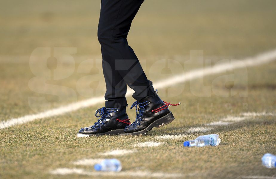 Dan Alexa a fost îmbrăcat în costum și helancă neagră, plus o pereche bocanci șic. Ce a atras atenția au fost șireturile roș-albastre! După meci, antrenorul a spus că nu a remarcat culorile șireturilor.