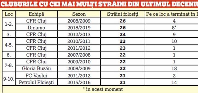 Iar dacă ar fi apucat să debuteze și Gregory Tade, semnat, și Ivan Hladik, sosit în România, fără ca afacerea să se mai perfecteze din cauze financiare, Dinamo ar fi deținut recordul absolut! În ediția 2008/2009, CFR Cluj a folosit 32 de jucători în total, dintre care 26 de străini, în timp ce în campionatul actual bucureștenii au avut 26 de străini din totalul de 45 de jucători rulați.
