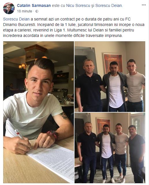 A SEMNAT! Impresarul Cătălin Sărmășan a anunțat că jucătorul Deian Sorescu a semnat azi un contract pe 4 ani cu Dinamo, așa cum Gazeta Sporturilor a anunțat în exclusivitate. Jucătorul va deveni oficial al "câinilor" începând de la 1 iulie.