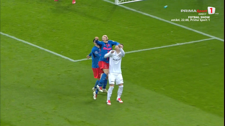 În minutul 37 al partidei, Louis Munteanu a căzut în careu, după un duel aerian cu Vlad Chiricheș. Atacantul a acuzat o lovitură peste față cu antebrațul și a solicitat penalty, însă arbitrul Colțescu a lăsat jocul că continue.
