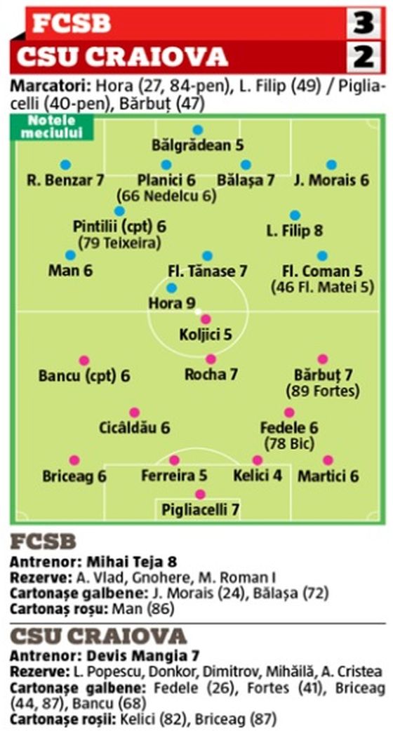 De departe, artizanul victoriei steliste a fost Ioan Hora. Vârful de 30 de ani a reușit o „dublă”, aducând cea mai importantă victorie a roș-albaștrilor din 2019. Gazeta l-a recompensat pe fostul golgeter al Ligii 1 cu nota 9, iar evoluția îndreptățește decizia lui Mihai Teja de a-l lăsa pe Harlem Gnohere pe banca de rezerve.