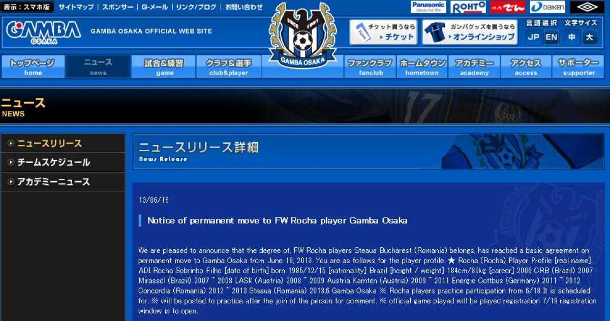 Brazilianul a semnat cu formaţia japoneză Gamba Osaka, anunţă site-ul oficial al clubului. Alături de Rocha, şi Takashi Usami a revenit la club după ce a trecut pe la Hoffenheim şi Bayern.