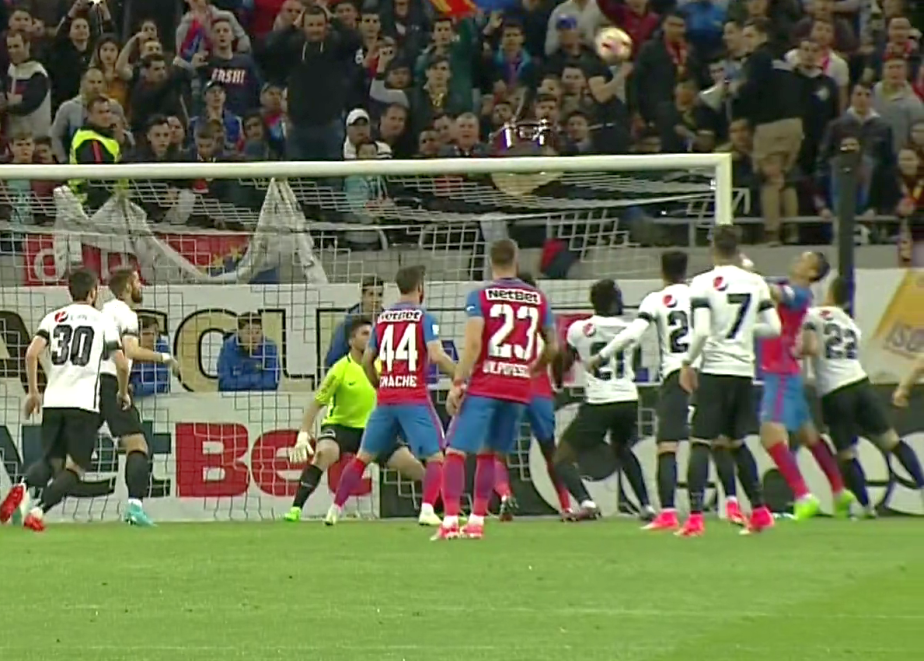Cu un minut înainte ca FCSB să deschidă scorul, Denis Alibec a cerut și el o lovitură de pedeapsă, după o intervenție a lui Țîru asupra sa. Și de această dată arbitrul a lăsat jocul să continue.