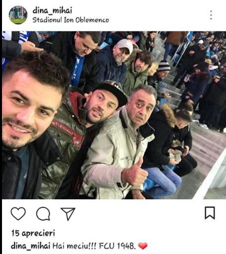 Dina postat o imagine pe Instagram și a scris la descriere: "Hai meciu (sic) !!! FCU 1948" adăugând și o inimă ca emoticon. Se pare că fotbalistul ar fi făcut referire la echipa din Liga a 4-a, însă n-a fost iertat de fani pentru prezența la meciul lui CS U.
