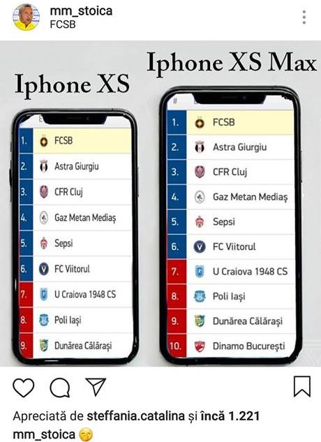 Cunoscut pentru ironiile cu care ne-a obișnuit de-a lungul anilor, MM a recidivat în această dimineață și a postat o fotografie pe Instagram prin care satirizează locul ocupat de Dinamo în clasament (n.r - locul 10, după 10 etape).