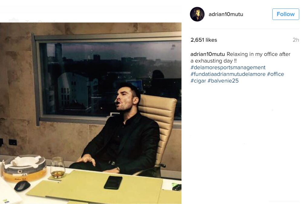 Imaginea apărută pe o rețea de socializare îl arată pe Adi Mutu la birou, în timp ce fumează trabuc și cu un pahar de whiskey în față. La descriere, oficialul dinamovist a scris "relaxându-mă la birou, după o zi extenuantă!"