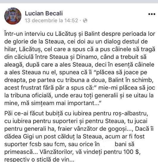 "Balint, acel frustrat fără păr", "Fraier vânzător de gogoși" și "Vânzătorilor, vă vindeți pentru 100$", sunt câteva dintre acuzele grave lansate de Lucian Becali prin intermediul contului personal de facebook.