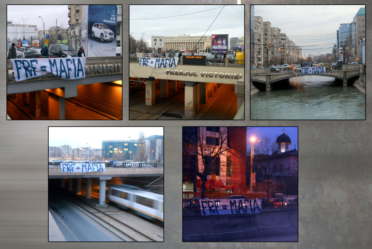 Suporterii români continuă protestele împotriva şefilor fotbalului românesc! Indiferenţi la conferinţa de presă pe care Mircea Sandu a susţinut-o în compania vechilor lideri ai suporterilor, cei de la Asociaţia Suporterilor Români şi-au sesizat nemulţumirea prin bannere împrăştiate prin punctele cele mai circulate din Capitală. "FRF=MAFIA" s-a putut citi în Piaţa Victoriei, în Piaţa Unirii şi pe Bulevardul Kogălniceanu (vezi galeria foto).