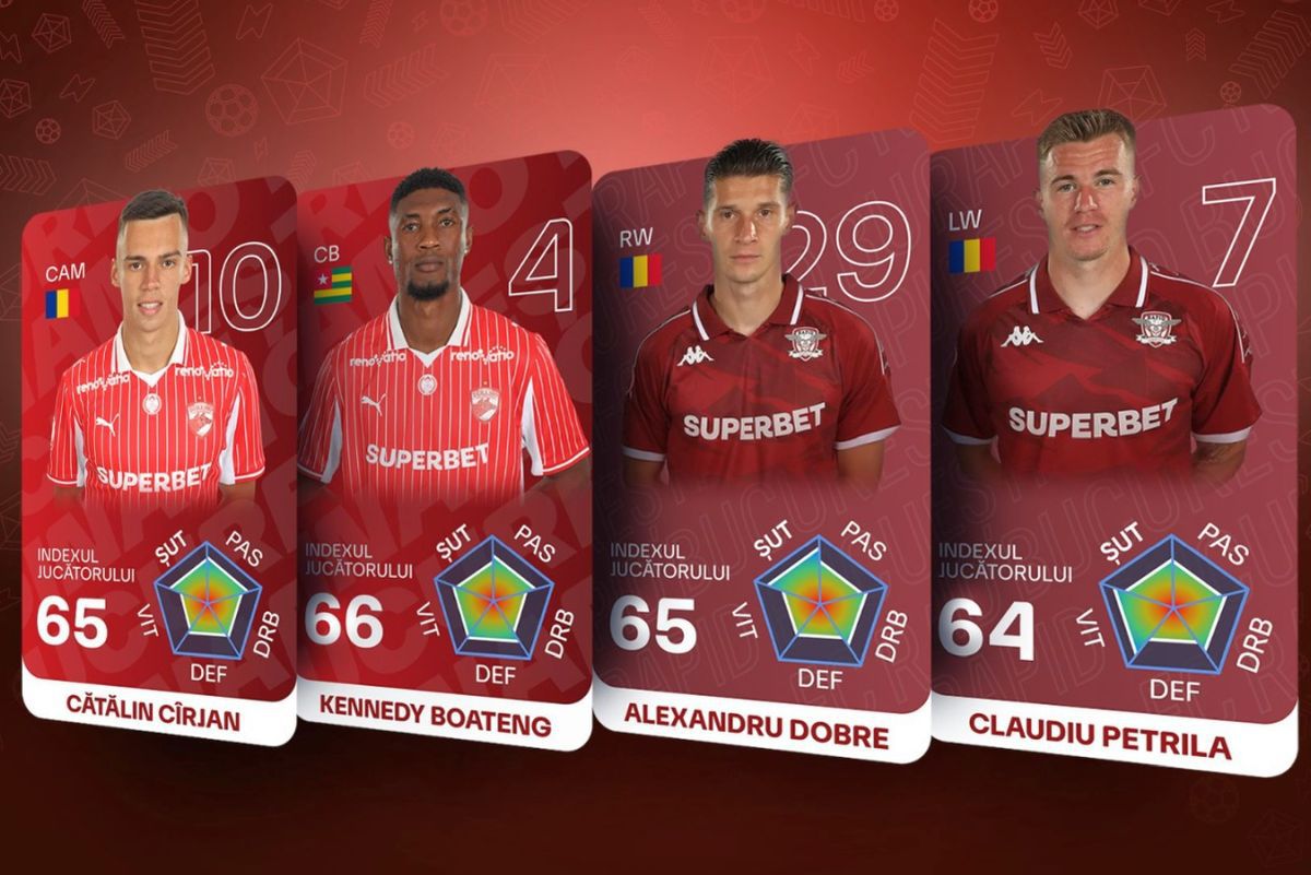 Inspirate direct din celebrele simulatoare de fotbal (precum FC24/FIFA), acestea vor afișa evaluări pe o scară de 100 de puncte, oferind un context rapid asupra formei și abilităților protagoniștilor de pe gazon.