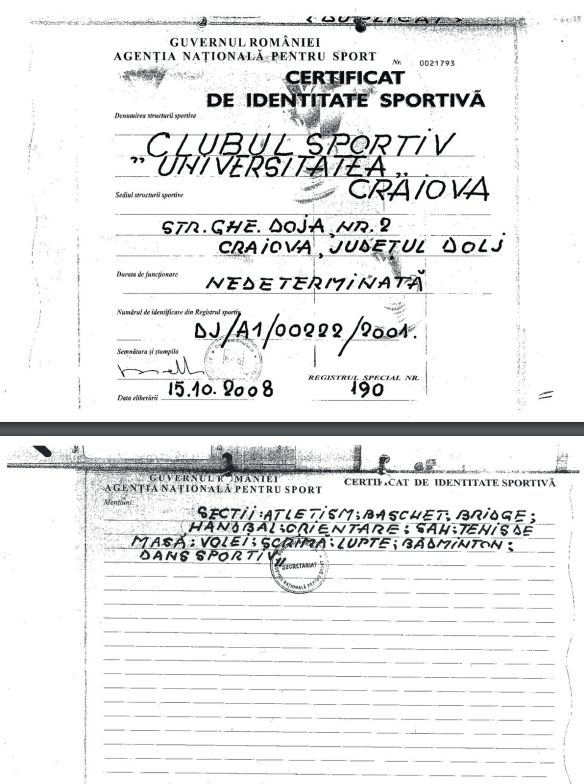 Motivul? Echipa din Liga 1 s-ar trage dintr-un Club Sportiv înființat de la zero în 1995, conform certificatului fiscal (foto facsimil mai jos), fără nicio treabă cu structura originală din '48! Noul CS Craiova avea doar secții de alte sporturi și și-a făcut una de fotbal abia în 2013, pentru a lua naștere CraiOlguța.