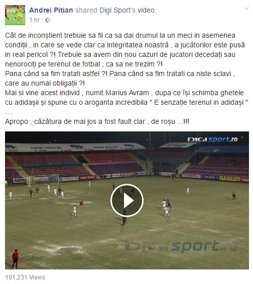 Jucătorul celor de la Pandurii, Andrei Pițian, 21 de ani, a scris un mesaj dur pe Facebook în care îl critică pe Marius Avram, după ce acesta a permis disputarea meciului dintre ASA și Pandurii, care s-a oprit după 45 de minute, la 2-0 pentru ASA, după ce jucătorii gorjeni au refuzat să mai revină pe teren după pauză.