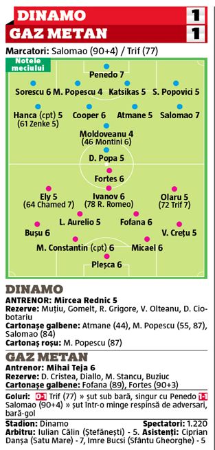 Dinamo a smuls un egal pe teren propriu cu Gaz Metan, scor 1-1, în ultima secundă datorită reușitei lui Salomao din minutul 4 al prelungirilor. De partea cealaltă a înscris Trif, în minutul 77.