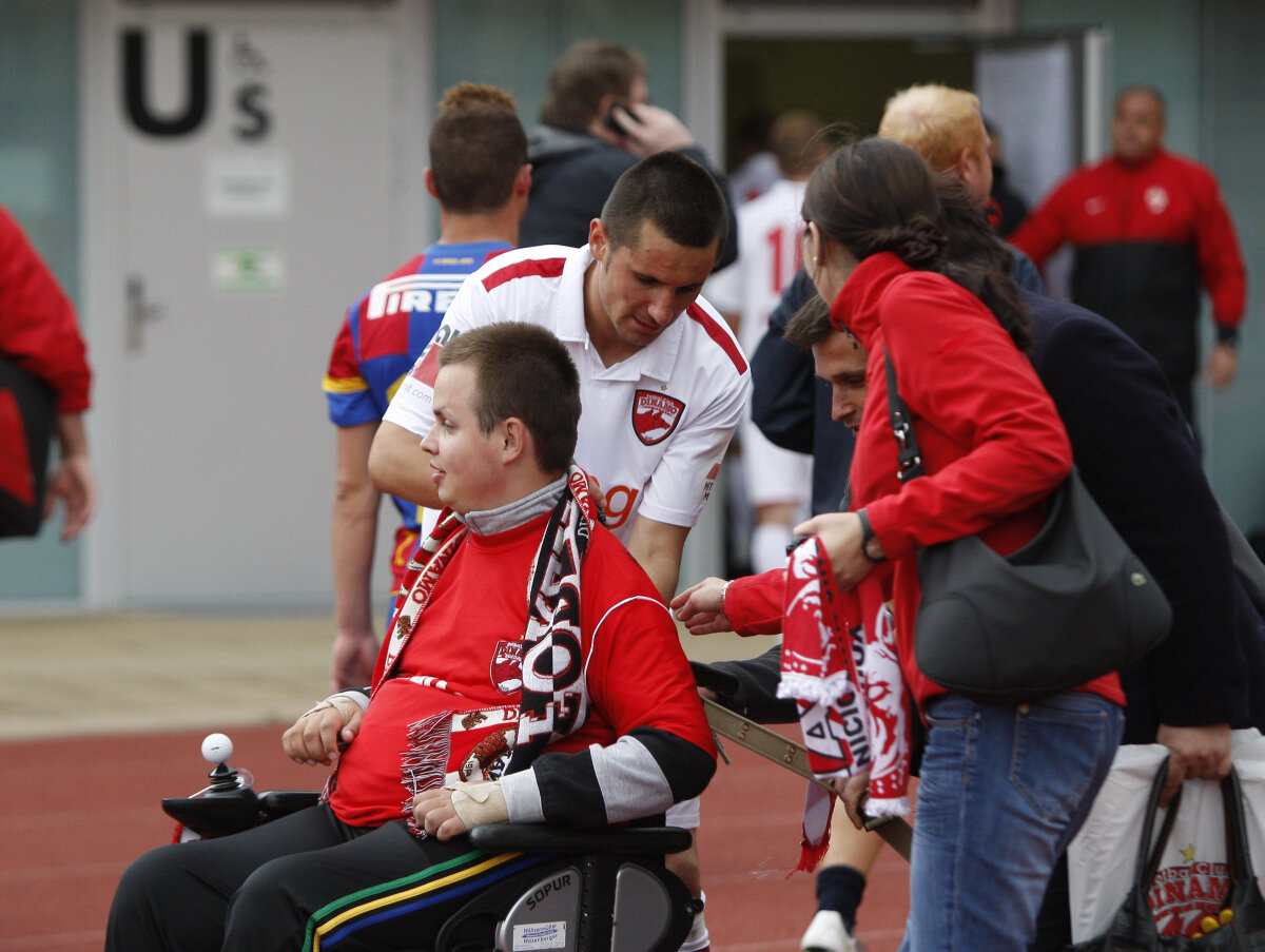 Unul dintre ei, cu handicap locomotor şi îmbrăcat cu însemnele "cîinilor", a primit autografe din partea tuturor jucătorilor pe un tricou cu Dinamo.