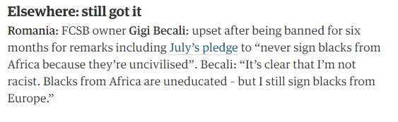 "Proprietarul FCSB-ului, Gigi Becali, este supărat după ce a primit o suspendare de şase luni din cauza unor declarații, incluzând aici "nu voi mai transfera niciun jucător de culoare din Africa, pentru că sunt necivilizaţi". Becali: «Este clar că nu sunt rasist. Fotbaliştii de culoare din Africa sunt needucaţi - dar voi transfera jucători de culoare din Europa»", au scris englezii.