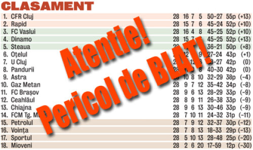 Liga 1 nu scapă de blaturi. Adrian Porumboiu a acuzat făţiş că meciul CFR- Oţelul 2-0 ar fi fost aranjat. Gigi Becali a spus la fel despre Dinamo - Ceahlăul 3-2, Chiajna - Dinamo 1-3 şi Vaslui - Astra 2-1, în timp ce Gheorghe Ştefan şi-a acuzat propriii jucători la înfrîngerea cu CFR, 0- 2, de sîmbăta trecută.