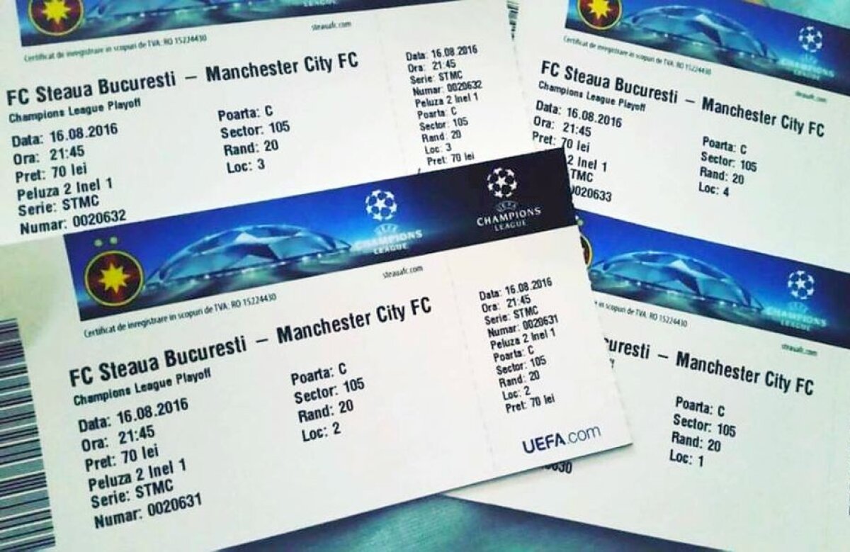 Deși rezultatul din tur nu mai dă nicio șansă Stelei să revină, reprezentanții vicecampioanei României au pus în vânzare la casele de la Arena Națională bilete pentru returul cu Manchester City. Un tichet costă 22 de lire sterlina, iar plata acestora se poate face doar în monedă britanică.