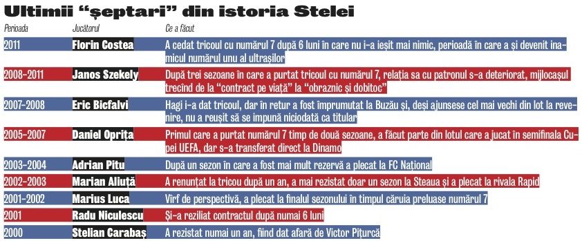 Din 2000, după ce Marius Lăcătuş a plecat de la Steaua, nici unul dintre fotbaliştii care au purtat tricoul cu numărul 7 n-a avut noroc! Nu mai puţin de nouă jucători au încercat să devină "noul Lăcătuş", dar şi-au rupt gîtul! Singurul care a purtat tricoul mai mult timp, fără să aibă însă realizări deosebite, a fost Janos Szekely. Bănăţeanul deţine recordul de durată ca "şeptar" în Ghencea, bifînd trei sezoane consecutive.