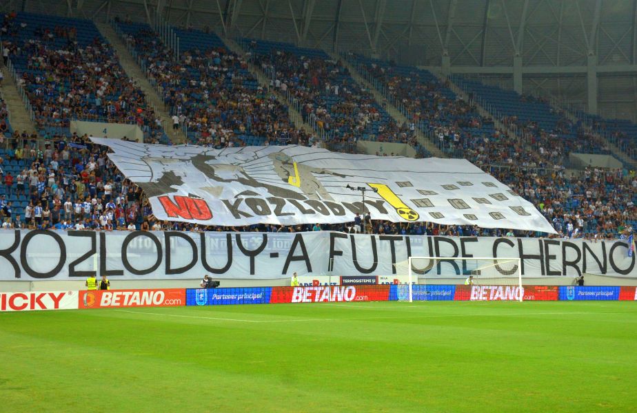 "Kozlodui, viitorul Cernobîl" a fost banner-ul fanilor olteni, prin care aduc aminte de tragedia din 1986 din Ucraina, cel mai mare accident din istoria energiei nucleare.