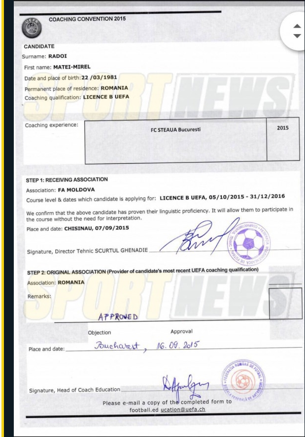 Sa nu stie distinsul jurnalist anonim ca fotbalul cu tot ce reprezinta el, antrenori, jucatori, organizare, competitii, disciplina etc, este reglementat sportiv de foruri internationale, FIFA si UEFA?? Pai daca aceste foruri permit calificarea antrenorilor si la Scoli de sub egida lor, altele decat cele din tara "candidatului" (Italia, Franta, Moldova...etc), poate ne precizeaza jurnalistul anonim ce "sistem va pacali Radoi"??.....Ori scriem asa, la deruta, pentru "prostime"!..:)