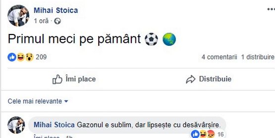 În stilu-i caracteristic, MM Stoica a comentat, la rândul său, starea gazonului de la meciul din această seară. "Primul meci jucat pe pământ. Gazonul e sublim, dar lipsește cu desăvârșire".