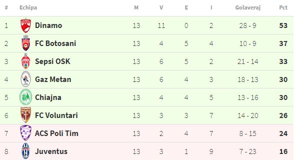 Dinamo are 11 victorii și două înfrângeri în play-out. A ajuns la al 6-lea succes consecutiv și conduce detașat clasamentul, având 53 de puncte. Poli Timișoara are 24 de puncte și e pe locul 7, retrogradabil.