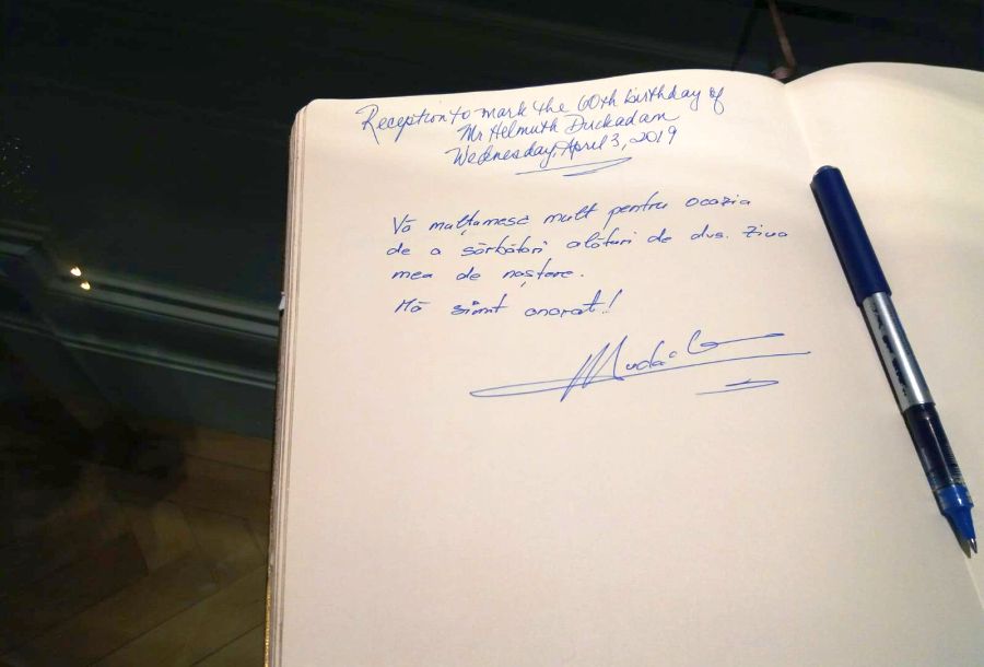 „Sunt foarte recunoscător că ați onorat această invitație. La mulți ani, Helmuth Duckadam. Vreau acum să vă invit la un toast pentru Helmuth. Avem un cadou și o sarcină.