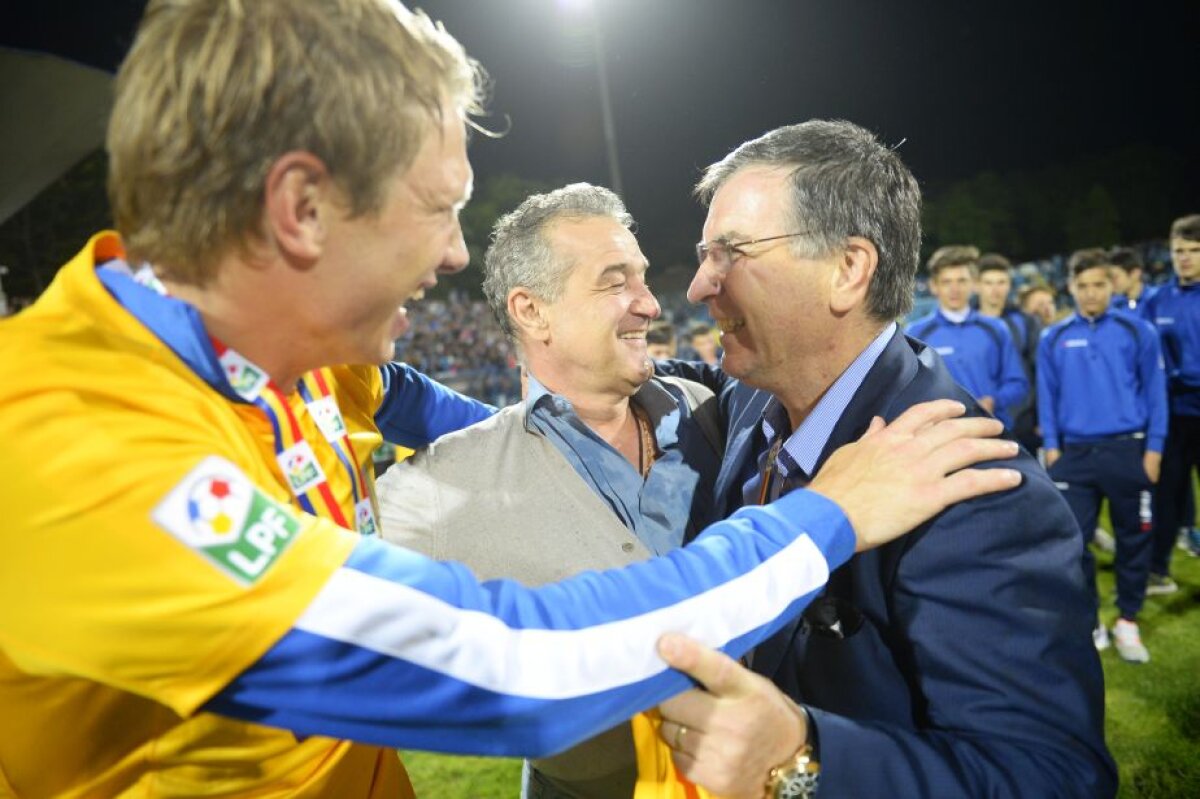 Jucătorii au așteptat cu sufletul la gură ca meciul de la Tg. Mureș să se termine pentru a fi siguri că sînt campioni. În momentul în care partida dintre ASA și Oțelul s-a încheiat, scor 1-2, a început nebunia pe gazonul de la Iași.