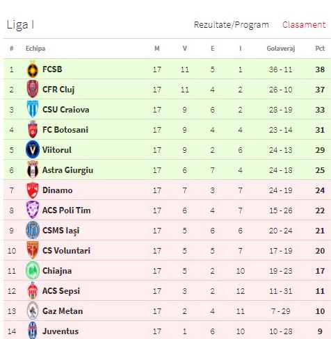 Clasamentul ligii 1 după 17 etape