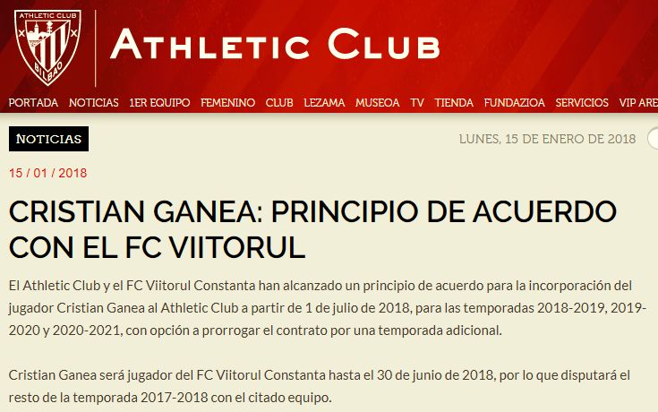 "Athletic Club Bilbao și FC Viitorul au ajuns la un acord de principiu pentru transferul jucătorului Cristian Ganea la gruparea bască, începând cu data de 1 iulie 2018. Ganea va semna pe trei sezoane cu Athletic Club Bilbao (2018/2019, 2019/2020 și 2020/2021), cu opțiunea să-și prelungească contractul pentru un sezon suplimentar.