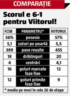 Deși diferența de puncte a fost una foarte mare, în favoarea roș-albaștrilor, nu mai puțin de 11 lungimi, la parametrii de joc, FCSB e sub Viitorul. De exemplu, volumul paselor reușite e superior pentru Hagi cu peste 15%, iar golurile încasate din faze fixe pentru Cojocaru și compania sunt mai puține cu 25%.