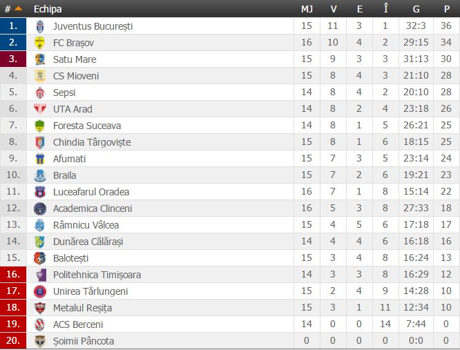 Astăzi s-au jucat primele meciuri din runda cu numărul 16 a Ligii a doua. Liderul Juventus București a obținut doar o remiză pe teren propriu cu Râmnicu Vâlcea, în timp ce ACS Berceni nu s-a prezentat la meciul de la Călărași (detalii AICI).
