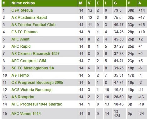 La finalul turului, Academia Rapid e pe locul 2 în clasamentul Ligii a 4-a, cu 38 de puncte, la egalitate cu liderul Steaua, dar cu golaveraj mai slab.
