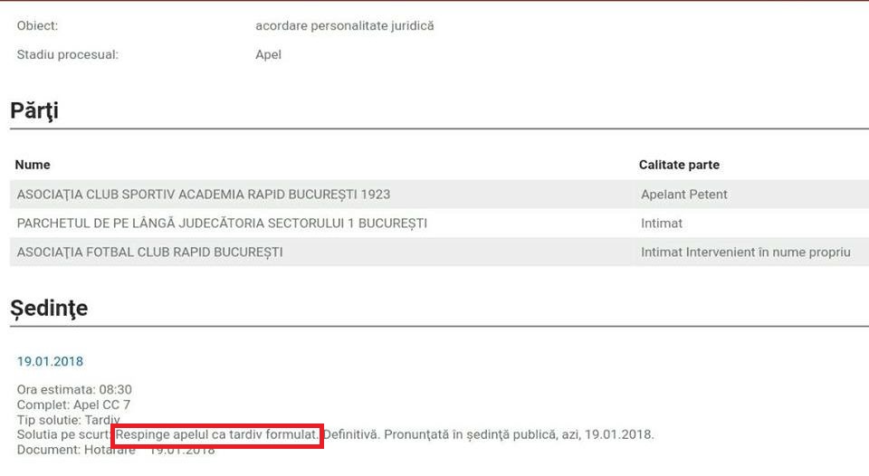Academia Rapid a pierdut definitiv dreptul de a avea personalitate juridică, după ce Tribunalul București a respins apelul giuleștenilor ca fiind "tardiv formulat".