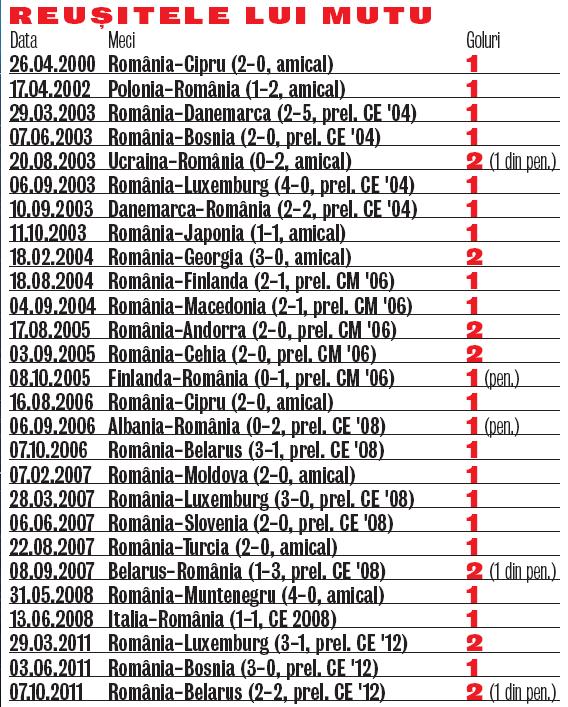 Mutu a pornit pe acelaşi drum în 2000, într-un amical cu Cipru, iar acum e doar la o lungime în spatele recordului deţinut de "Rege". În condiţiile în care, fără derapajele vieţii sale tumultuoase sau în absenţa accidentărilor agasante, "Briliantul" ar fi avut şansa să-l depăşească demult pe Hagi.