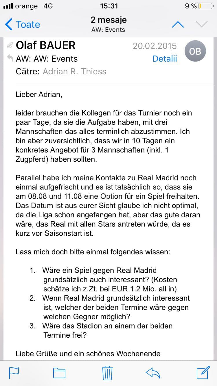 Corespondența online dintre Thiess și firma Olaf Bauer Sportfive, în limba germană, din care reies clar datele posibile pentru respectivul amical