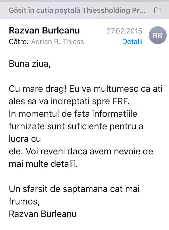 Din corespondența purtată de președintele Federației cu Adrian Thiess și Radu Berechet, doi dintre organizatori, reiese faptul că, la acel moment, Burleanu și-a manifestat disponibilitea pentru organizarea unui astfel de amical: